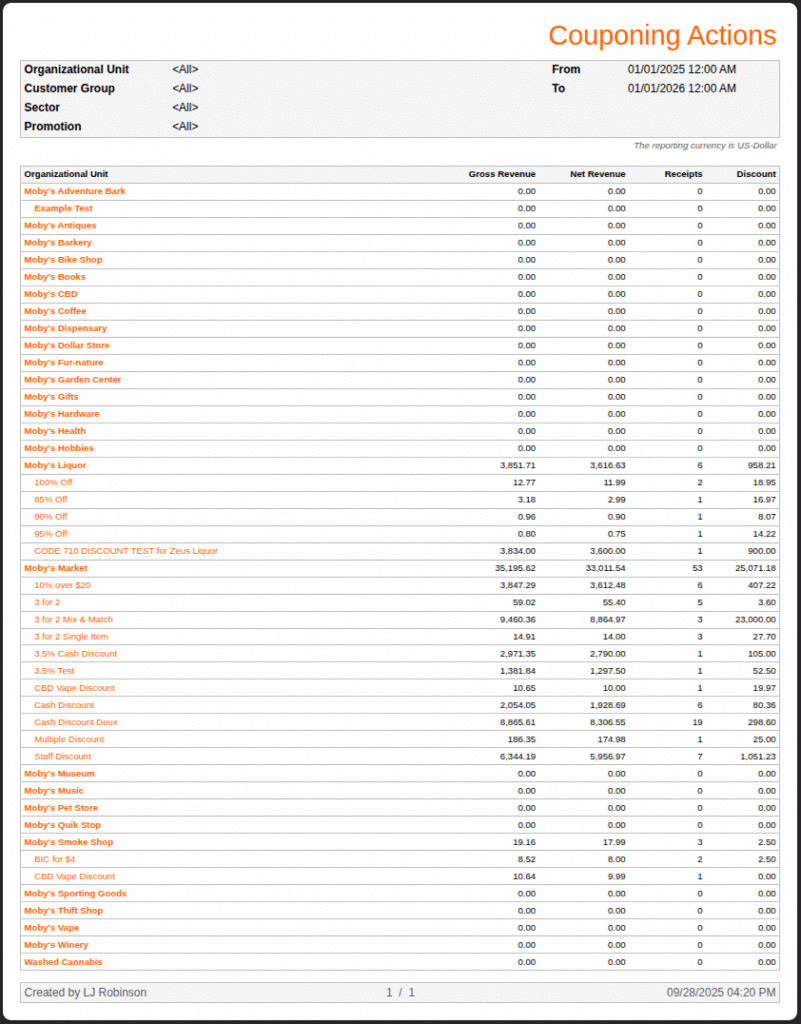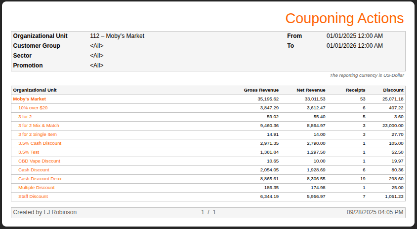 The Couponing Actions Report provides an in-depth, itemized breakdown of sales data related to coupons and promotions used during a specified time period. This report is crucial for evaluating the effectiveness and financial impact of your various coupon and discount strategies.