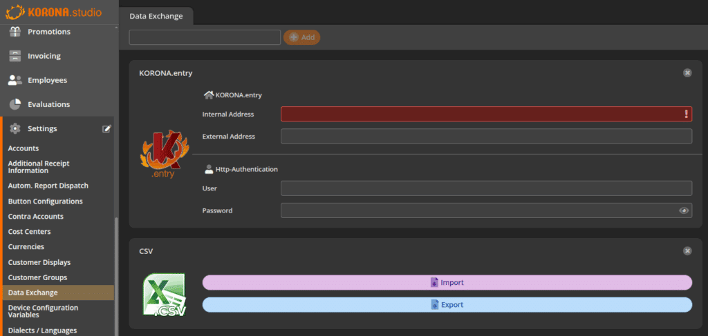 1. In the KORONA Studio, go to Settings > Data Exchange.
