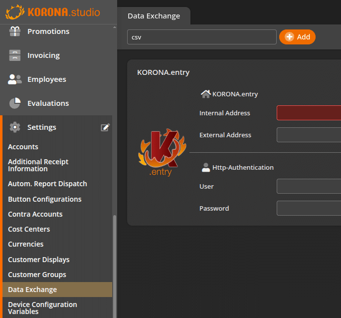 1. In the KORONA Studio, go to Settings > Data Exchange.