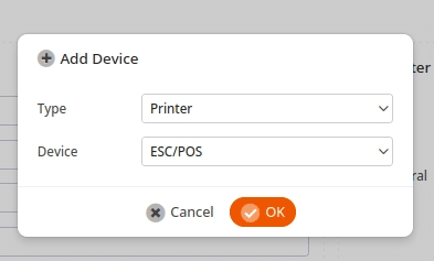 In the POS Profile, go to the Devices section and press Add. The “Type” will be “Printer” and the “Device” will be “ESC/POS”: