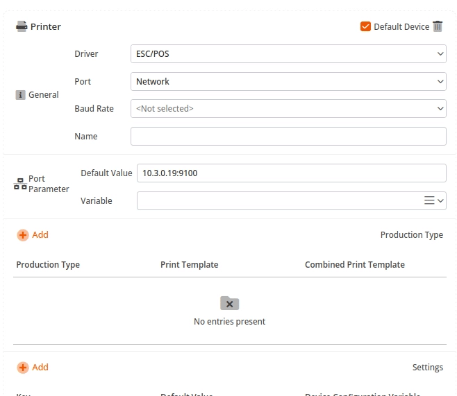 After adding the printer, change the “Port” to “Network”. Then, in the “Default Value” enter the IP address followed by :9100. This tells the POS that this printing is taking place over the network and not IP. When done, it should look similar to this: