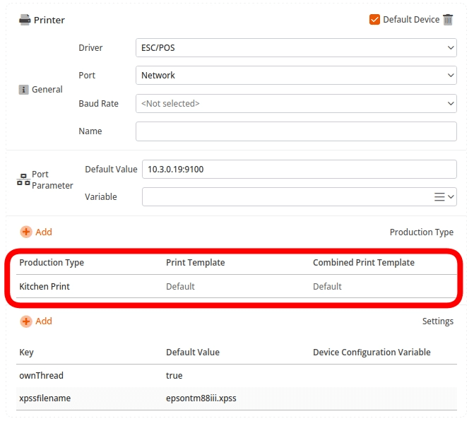 Go back to Settings > POS Profiles, where you initially added the printer. In the devices section, add the production type you created to the network printer