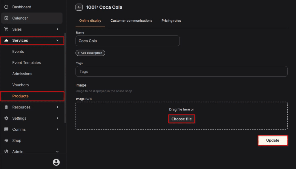 Under Services and on the Products page, you will find your list of products, where you can edit their details and upload an image. This image will appear on the KORONA Events shop.