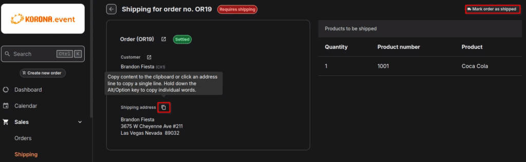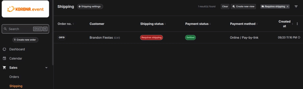 In the KORONA Event back office, you can see what needs to be shipped under Sales > Shipping.