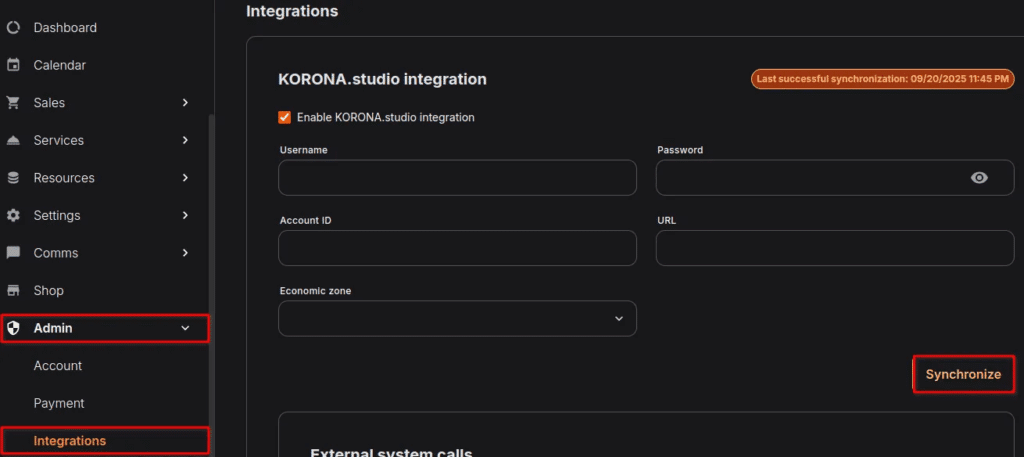 To synchronize the configured information, navigate to Admin> Integrations in the KORONA Events back office and click Synchronize.
