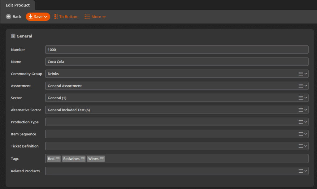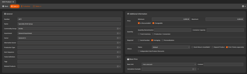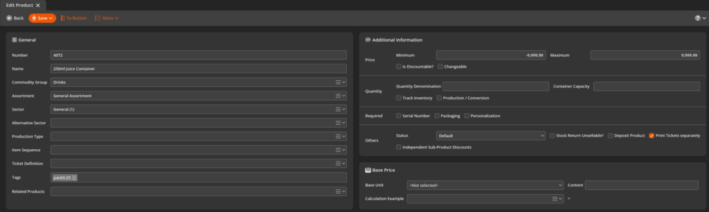 Create the product as you normally would. Give it a name, and assign a sector, assortment, and commodity group to it. In this example, we are charging at the bottle size. So we do not need to specify a price for the juice itself.