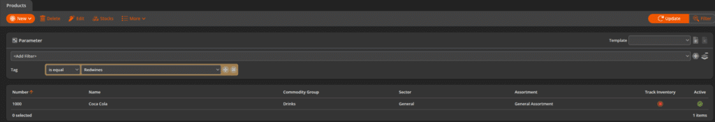 Product Tags can also be used to assist in searching for a certain category of products. In the screenshot below, we have used the “redwines” tag to filter and display all of the red wine products we have in stock. This is done by clicking the filter button at the top of the Products screen.