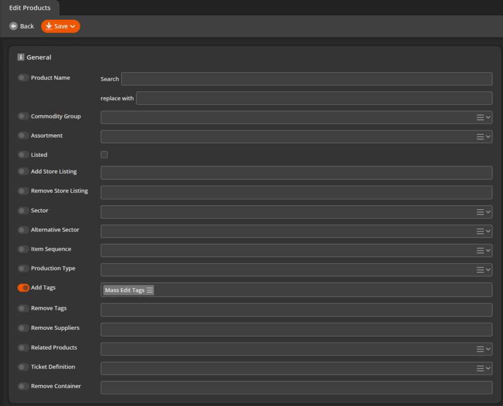 When you have finished adding your tags, save them by clicking the save button located at the top of the screen. The products you have selected will now have the tags you added. Any tags you have elected to remove will also be removed from those products.