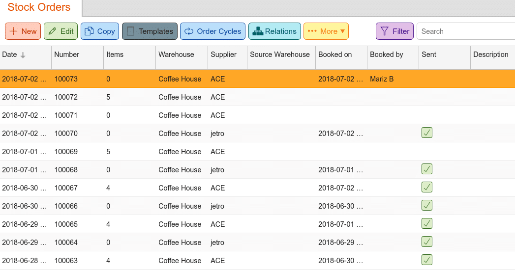 Once stock orders and stock receipts have been booked, they may seem to disappear from the cloud. All you have to do to see these previously booked items is hit the Filter button on the top right of the screen. This will show you all of your orders and receipts and will allow you to filter them as you wish (by supplier, date, warehouse, etc.)
