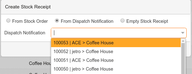 If a stock receipt had been created from dispatch prior to, a confirmation text box should appear with the following message “There already is a stock receipt for this dispatch notification. Create another one?” You may select Yes or No.