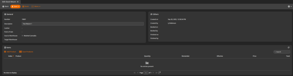 Once you are done click Book. (a pop dialog will state “Stock Return was saved successfully”)